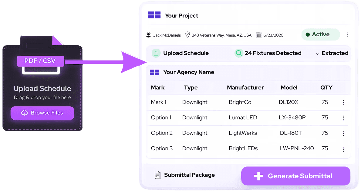 Upload your lighting schedule, select the exact fixtures you want, and instantly generate complete submittal packages with accurate part numbers and spec sheets.