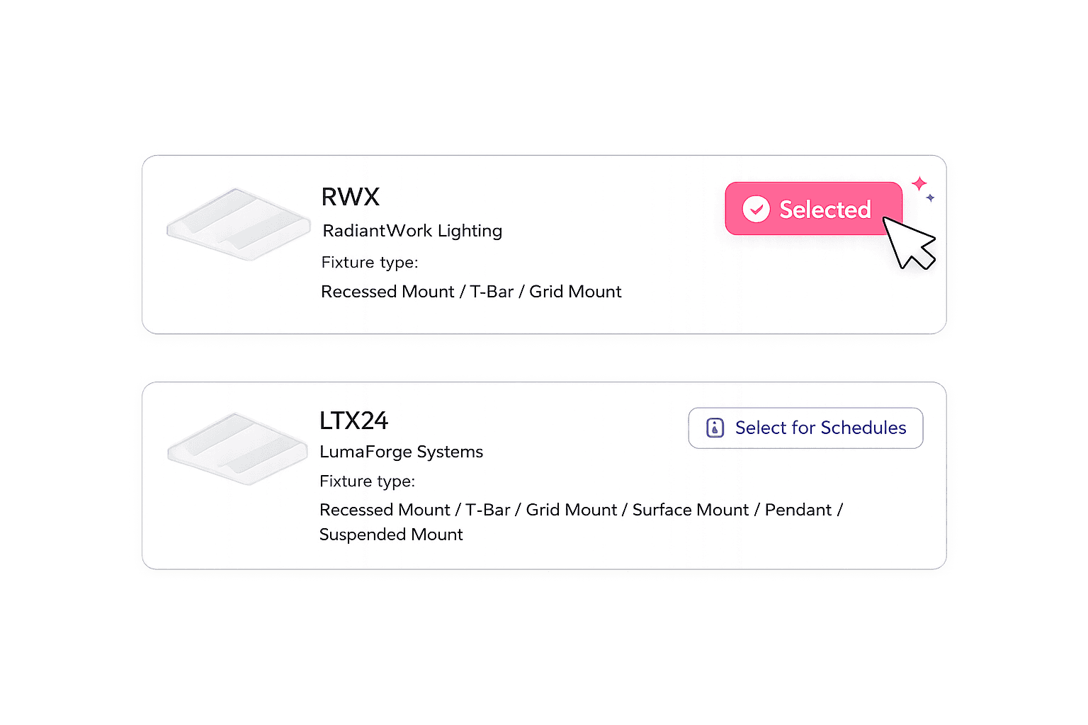 Drop in a PDF or CSV schedule and Luxion extracts fixtures, builds accurate part numbers, finds compliant fixture crosses from your line card, and organizes everything into your project—no manual lookup or formatting required.